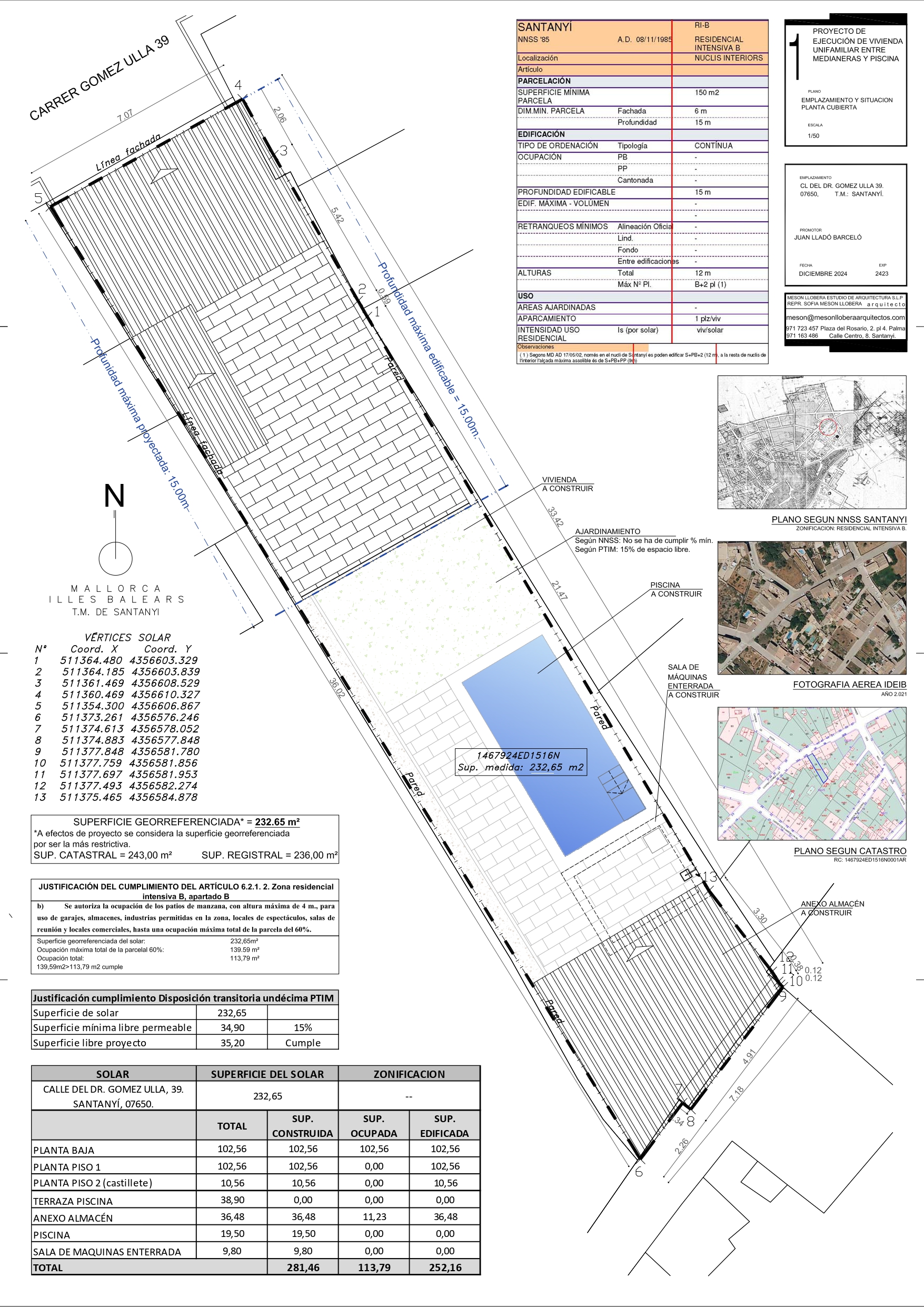 Im Herzen des beliebten und authentischen mallorquinischen Ortes Santanyí gelegen, bietet dieses 232 m² große Grundstück eine außergewöhnliche Gelegenheit, ein maßgeschneidertes Einfamilienhaus zu bauen. Für das Grundstück liegt ein gültiger Bauplan und eine Baugenehmigung für ein 280 m² großes Wohnhaus mit privatem Pool vor.