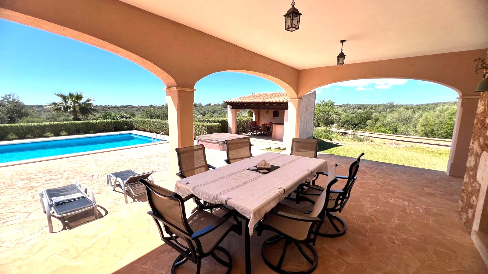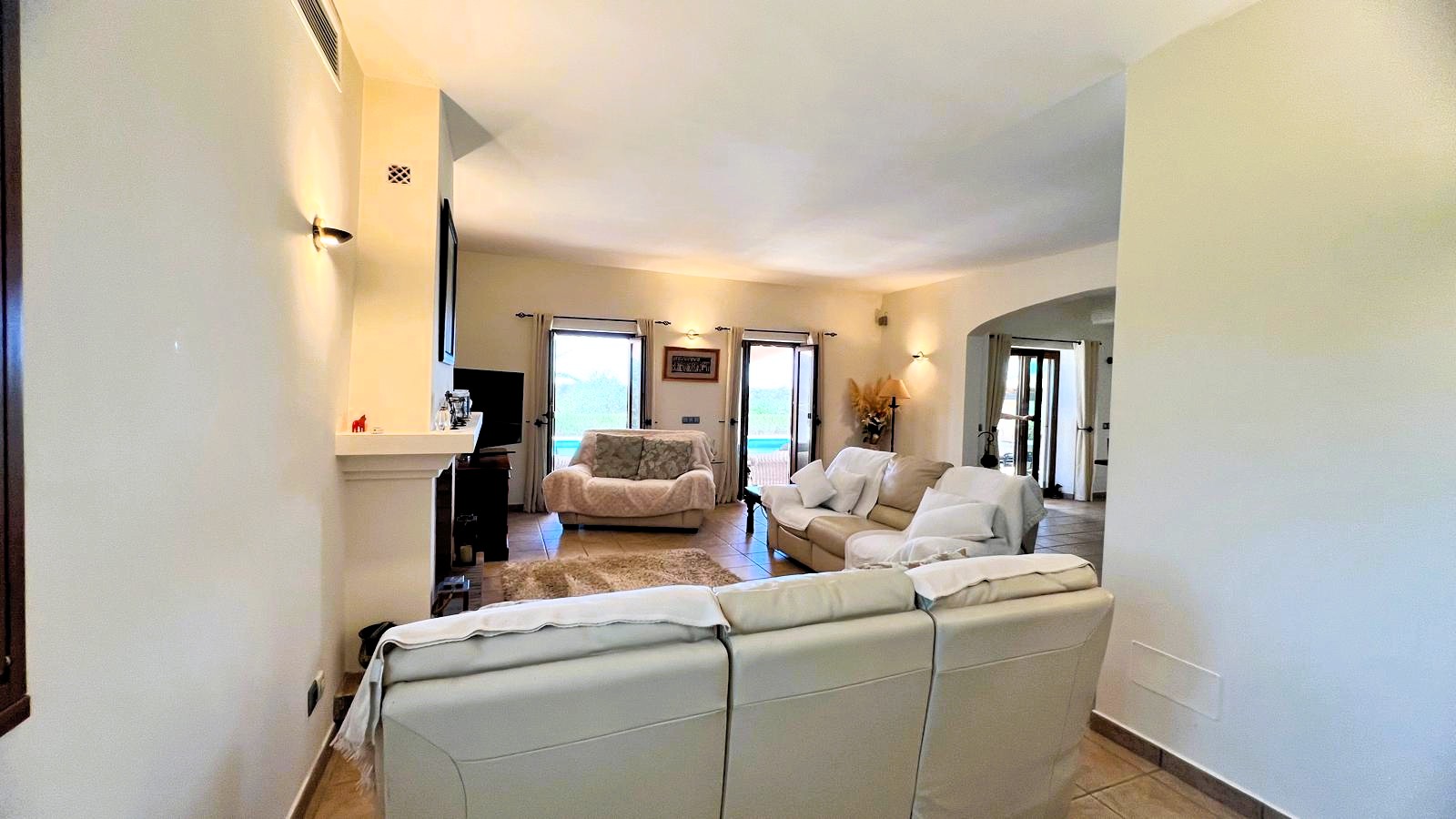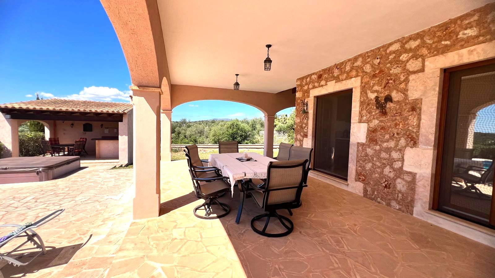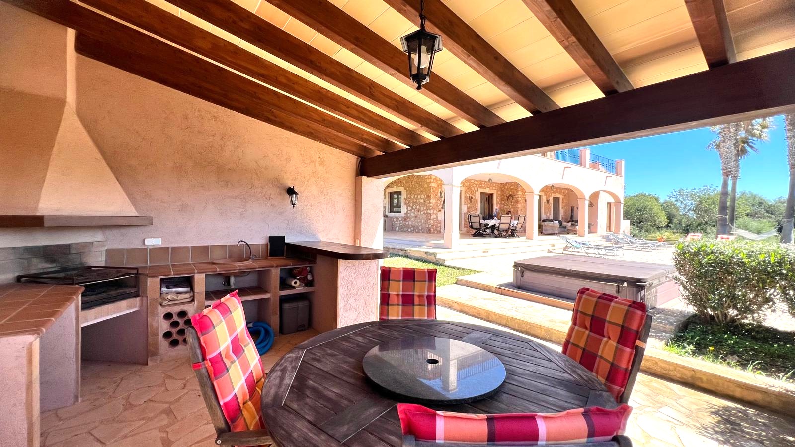 The large solid wood arched doors lead to a cozy reception hall, setting the tone for the quality and character that is felt throughout the home. The ground floor features a spacious open-plan living, dining, and kitchen area, all designed to make the most of natural light and perfectly connect with the outdoor spaces. From here you can see the large terrace, the pool, the jacuzzi, and the fully equipped outdoor kitchen, perfect for entertaining guests, hosting barbecues, and social gatherings.