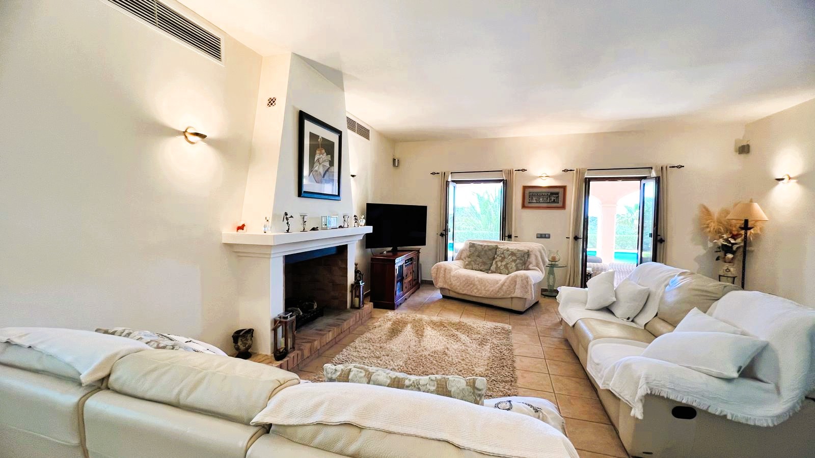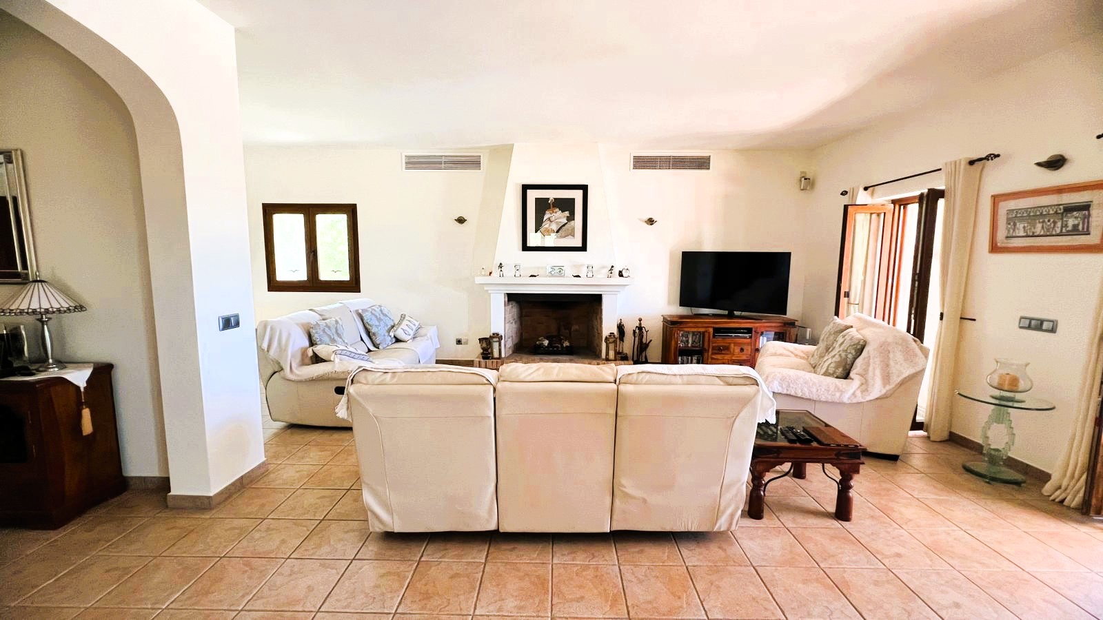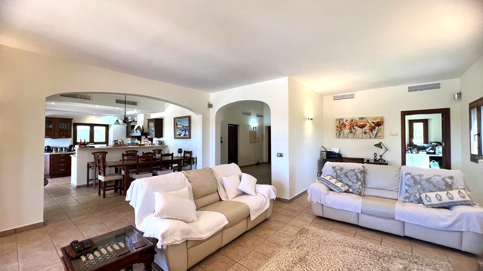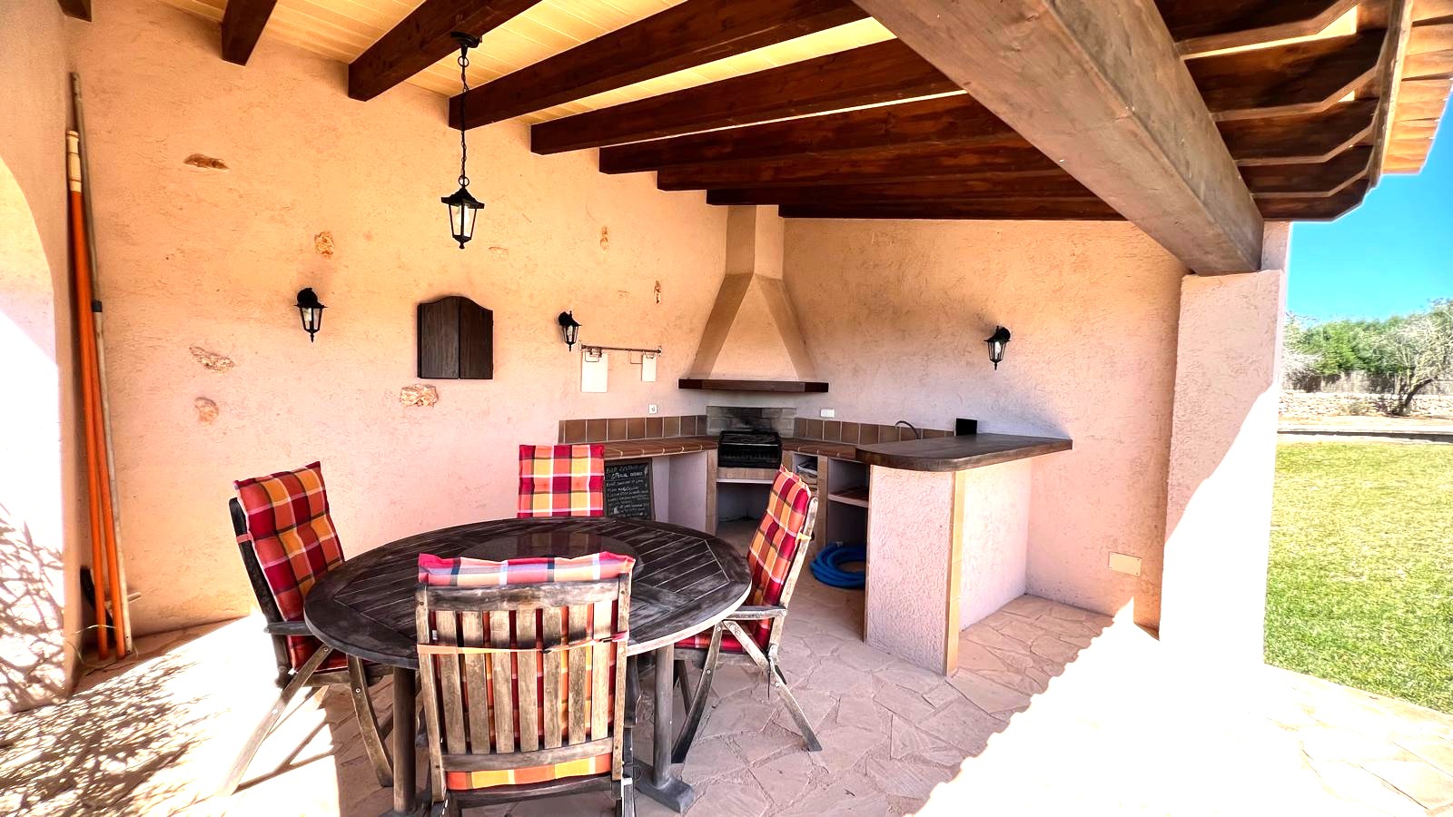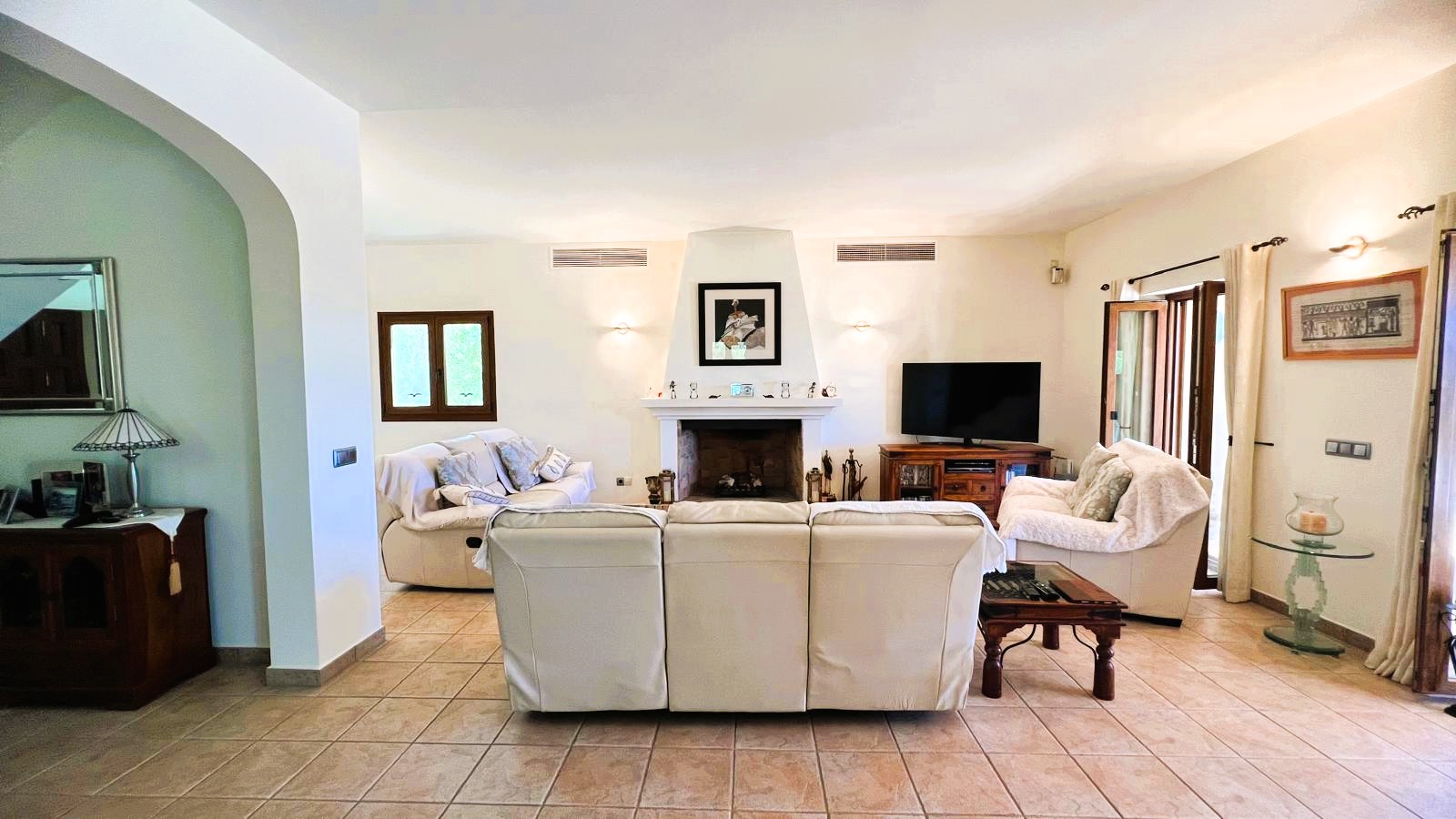 The large solid wood arched doors lead to a cozy reception hall, setting the tone for the quality and character that is felt throughout the home. The ground floor features a spacious open-plan living, dining, and kitchen area, all designed to make the most of natural light and perfectly connect with the outdoor spaces. From here you can see the large terrace, the pool, the jacuzzi, and the fully equipped outdoor kitchen, perfect for entertaining guests, hosting barbecues, and social gatherings.