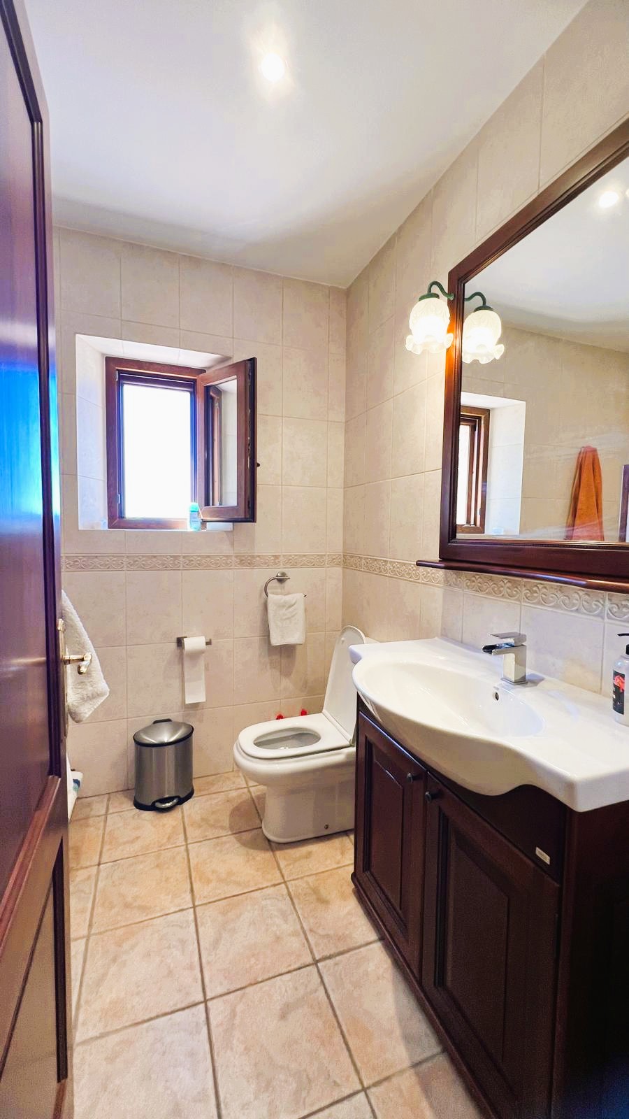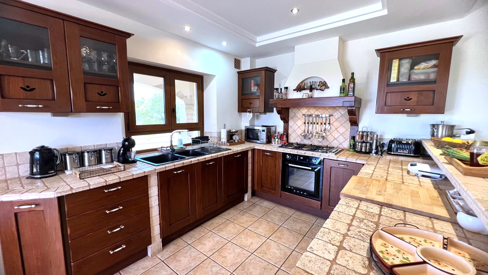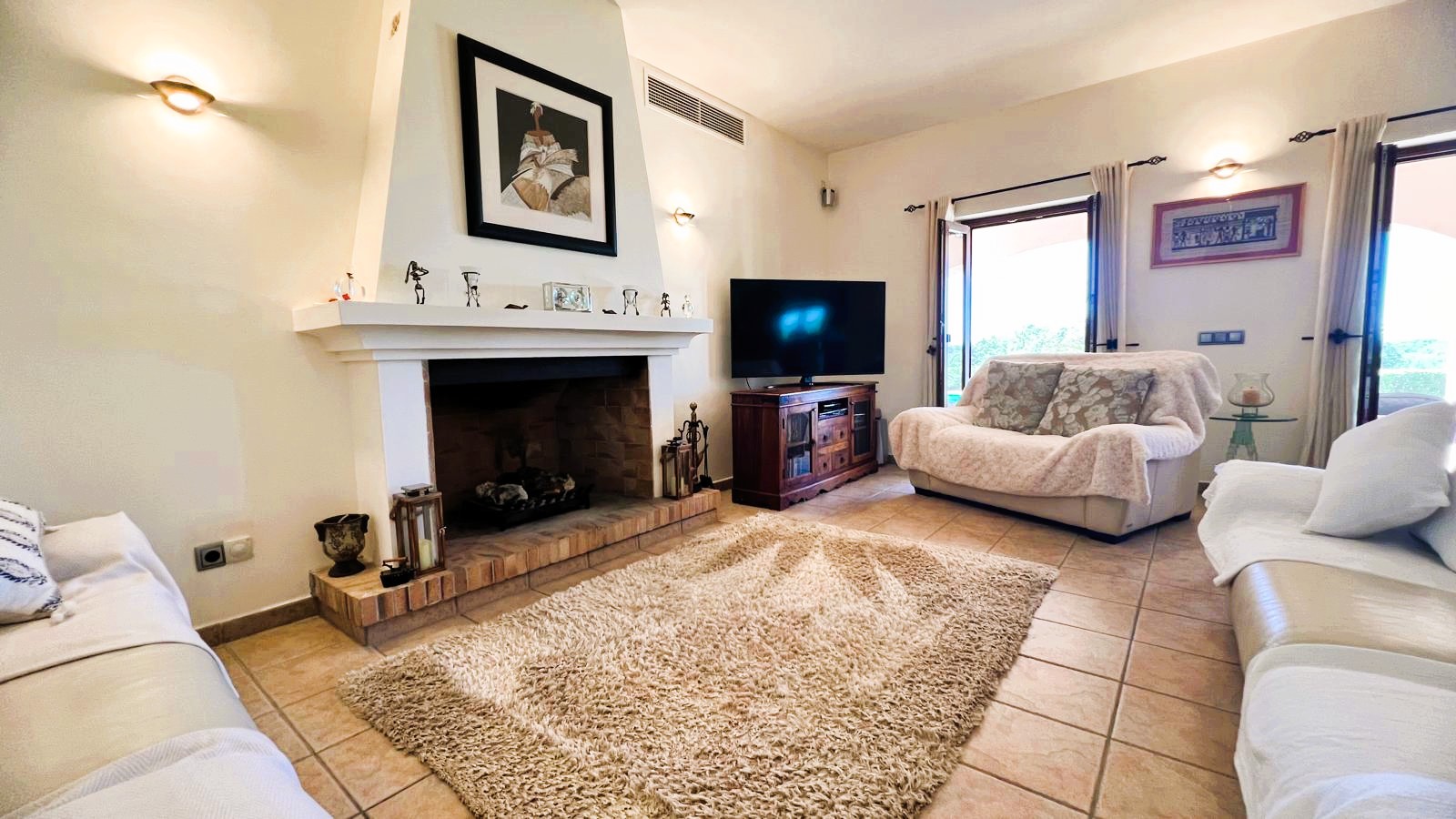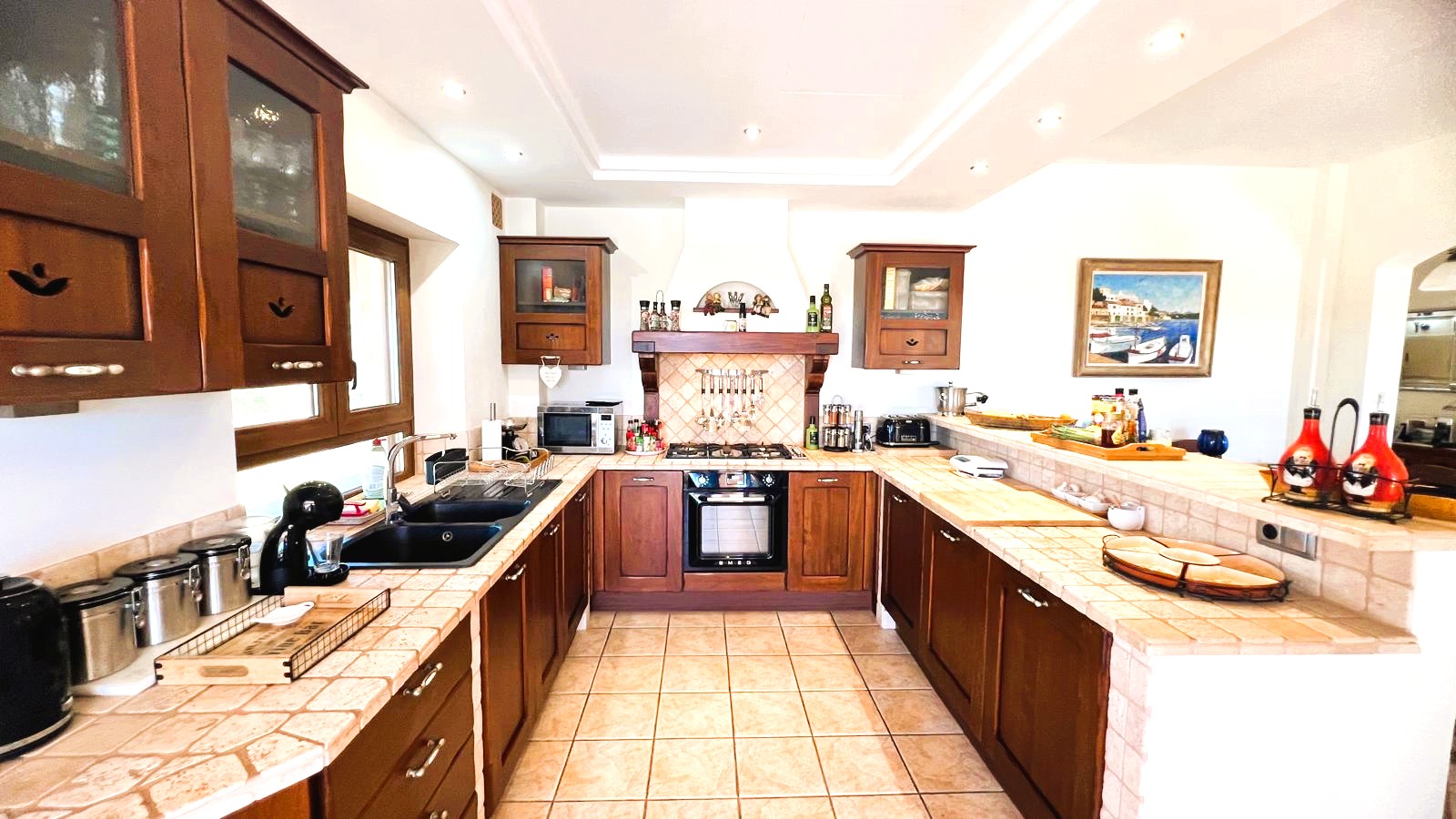 The large solid wood arched doors lead to a cozy reception hall, setting the tone for the quality and character that is felt throughout the home. The ground floor features a spacious open-plan living, dining, and kitchen area, all designed to make the most of natural light and perfectly connect with the outdoor spaces. From here you can see the large terrace, the pool, the jacuzzi, and the fully equipped outdoor kitchen, perfect for entertaining guests, hosting barbecues, and social gatherings.
